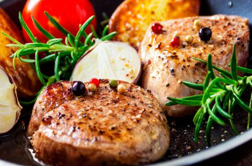 Genießen Sie zartes Schweinefilet mit knusprig gebratenen Kartoffeln, Rosmarin und Zwiebeln in pikanter Pfeffersoße.